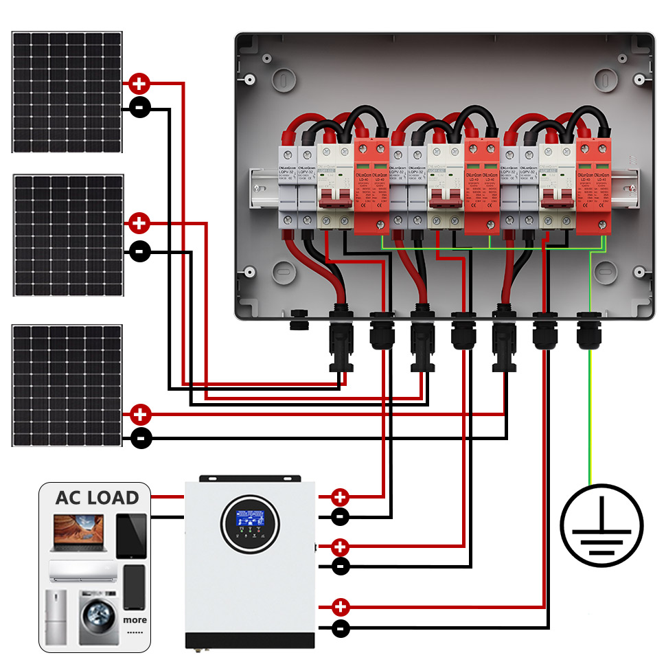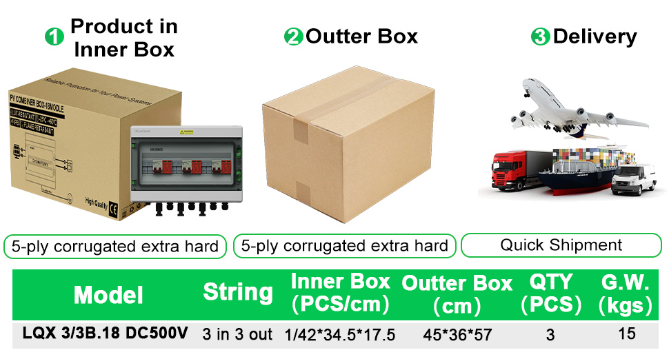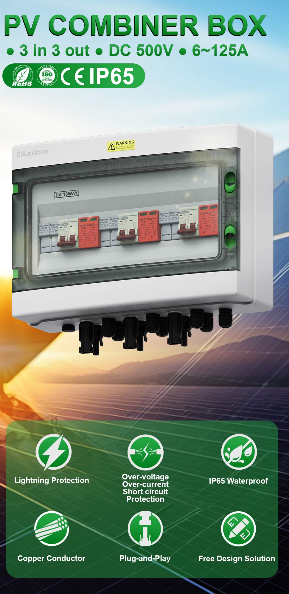 PV Combiner Kothak 3 ing 3 DC500V / 600V / 800V kanthi efektif nglindhungi inverters lan panel solar saka karusakan lan dikirim saka geni.