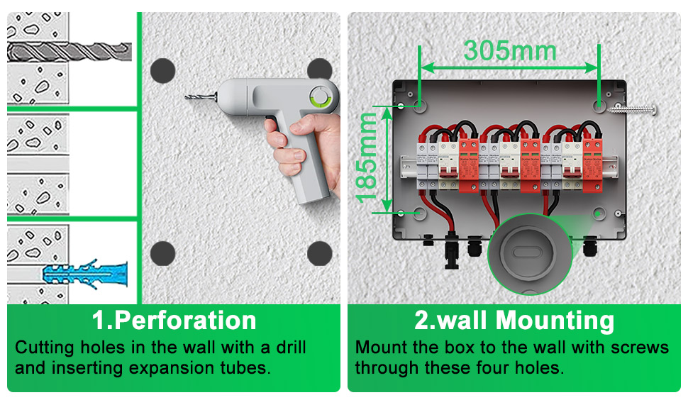 Dipasang ing kothak kasebut ing tembok kanthi ngawut-awut liwat papat bolongan kasebut.