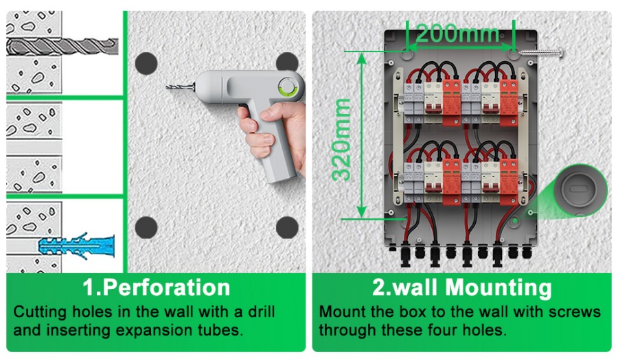 Dipasang ing kothak kasebut ing tembok kanthi ngawut-awut liwat papat bolongan kasebut.