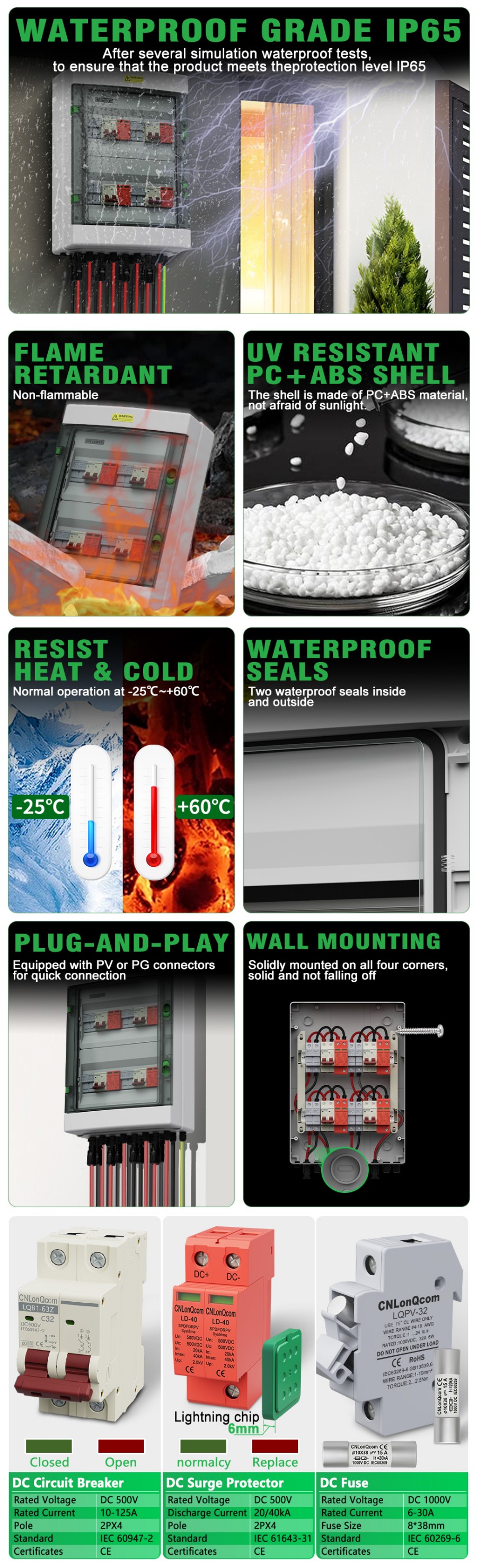 CNLlonQCom IP65 PV Combiner Kothak 4 ing 4 DC500V / 600V / 800v kanthi proteksi sirkuit lan perlindungan kilat mundhak lan sekring kanggo sistem DC surya, RV, omah